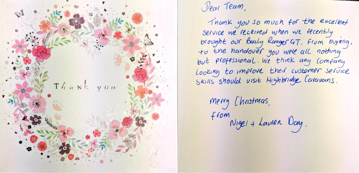 Thank you so much for the excellent service we received when we recently bought our Bailey Ranger GT. From buying, to the handover you were all nothing but professional. We think any company looking to improve their customer service skills should visit Highbridge Caravans.