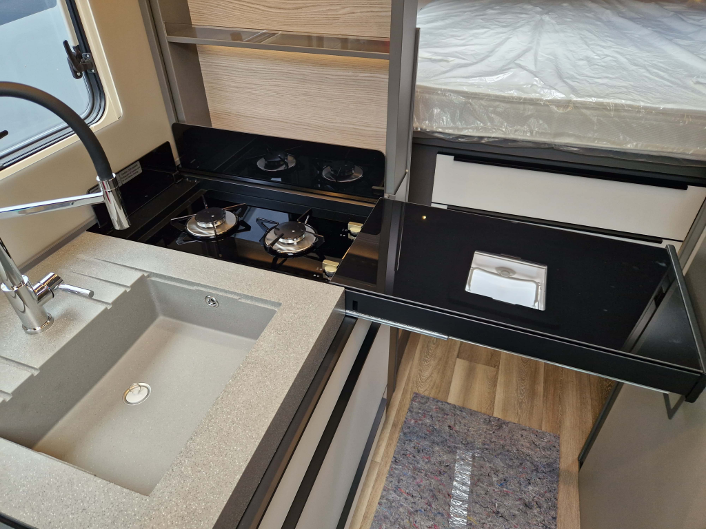 - Electrically adjustable isolation front plisse for the windscreen, Panorama Skylight to living room, Acoustic Walls, Flyscreen sliding door, Intuitive light concept (motion and light sensors), Confirt mattress, Aguti comfort seats